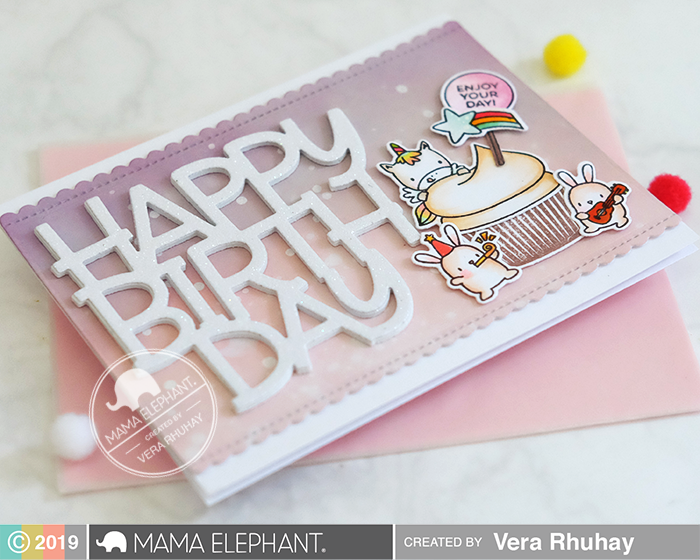 Hello friends, today is the last day of Mama Elephant Stamp Highlights. And today we are highlighting the Cupcake Wishes stamp set. I created a birthday card by combining with the Big Happy Birthday Creative Cuts and scallop frame from Sweet Feline Creative Cuts.