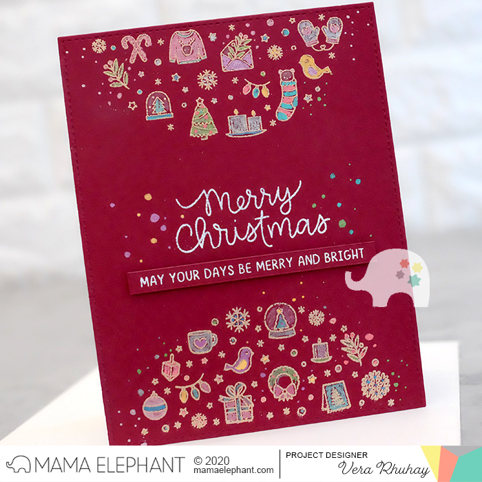 Hello friends! Happy Monday! and welcome to another Mama Elephant Stamp Highlight. Today the team is highlighting the Iconic Ornament stamp set. The Iconic Ornament stamp set includes one big ornament stamp made out of tiny holiday icons and some festive holiday sentiments.