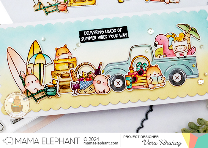 I stamped all images from Deliver Summer Vibes using Memento Ink-Rich Cocoa, colored them with Copic markers, cut them out with Deliver Summer Vibes - Creative Cuts, and applied to the card with foam tape.
